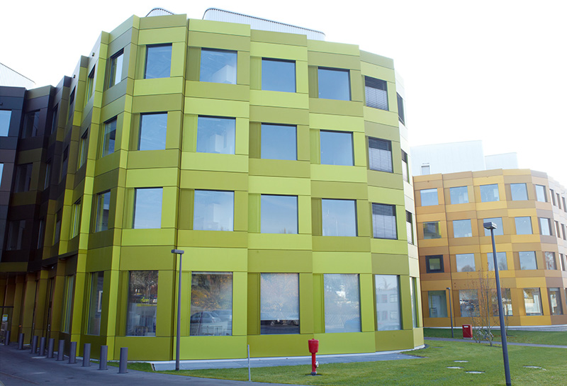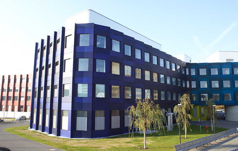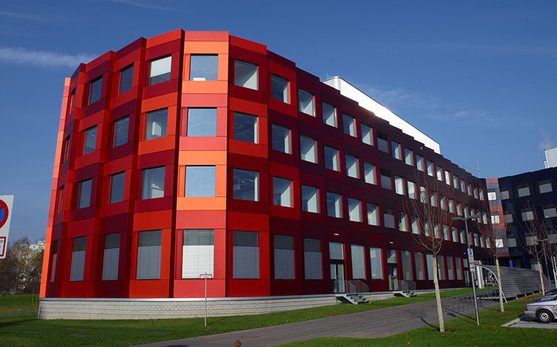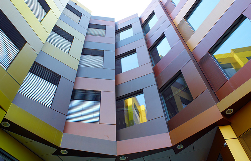位于德國吉森的生物研究中心,外墻由柏林建筑設(shè)計Behles Jochimsen挑選的28種由深到淺的顏色搭配組合而成,其使用的陽極氧化鋁板應(yīng)用的是難度極其高的Sandalor著色工藝,全球僅有7家氧化廠商具備此著色工藝,明亮的色彩,絢麗的光澤,不褪色及耐腐蝕能力的幕墻陽極氧化鋁板為一絲不茍的生物研究中心添加了活潑的氣息。